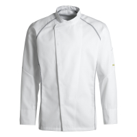 Die Kentaur Kochjacke hat verdeckte Druckknöpfe und einen eleganten Stehkragen für ein besseres Aussehen. Die grauen Flatlock Nähte sorgen für einen schönen optischen Kontrast. Für den besseren Komfort und mehr Dehnbarkeit befindet sich unter den Achseln und im Rückenbereich atmungsaktives Jersey. 1/1 Arm mit Kugelschreibertasche am linken Ärmel. Die Qualität dieser Kochjacke ist super leicht und angenehm zu tragen. Die verwendeten Garne sind nach Öko-Tex Standard 100 zertifiziert und auf Schadstoffe überprüft worden. Zusätzlich verfügt die Kentaur Kochjacke über das Ecolabel und ist problemlos in Großwäschereien zu waschen.