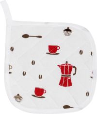 | Extras | mit beitseitigem Druck "Espressokännchen" mit Paspelband eingefasst und Aufhängerschlaufe |