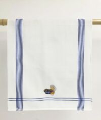 | Extras | Waffelpique in Baumwoll-Qualität mit hochwertiger Stickerei einer Bayerischen Brotzeit und passenden, umlaufenden Streifen in blau |